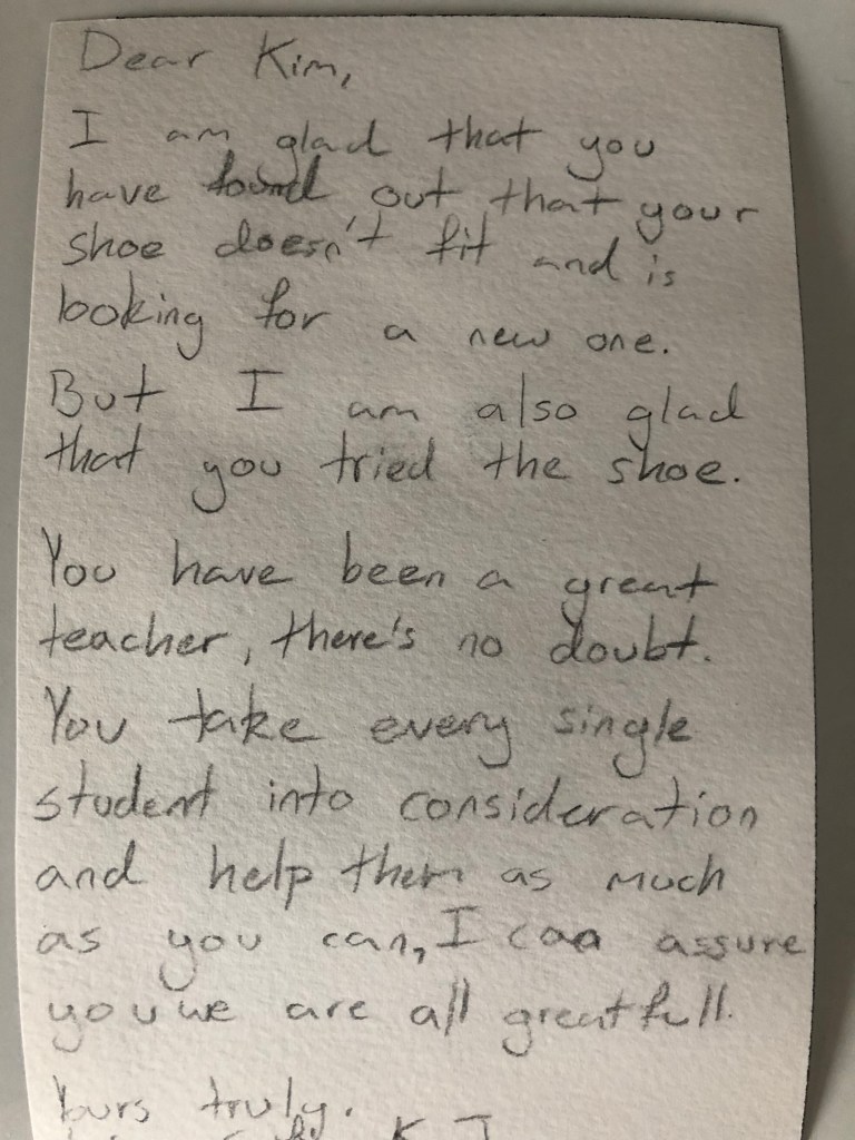 Last week, on one of our last days of school, we went walking in the woods. I had a student ask how to know when a job is right or not. I told her it was amazing she was asking a question like that at 14, as I think I’m still figuring it out at 49. I told her and a small group of other young women about my shoes and how they didn’t fit, and how I kept thinking I could make them fit by adjusting my needs. But then how I finally decided that adjusting myself to the point of pain and suffering did not make sense anymore, and I went out and found some shoes that were comfortable right from the start