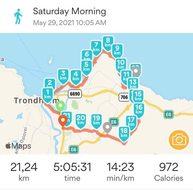 May 1: 10km. I met with Chin-Yu in person for the first time to discuss ideas and check out our compatibility. We walked from the pilgrim’s cafe at Nidarosdomen to lower Leirfossen. Super great vibe again. She is easy and inspiring to be with. Great discussions.