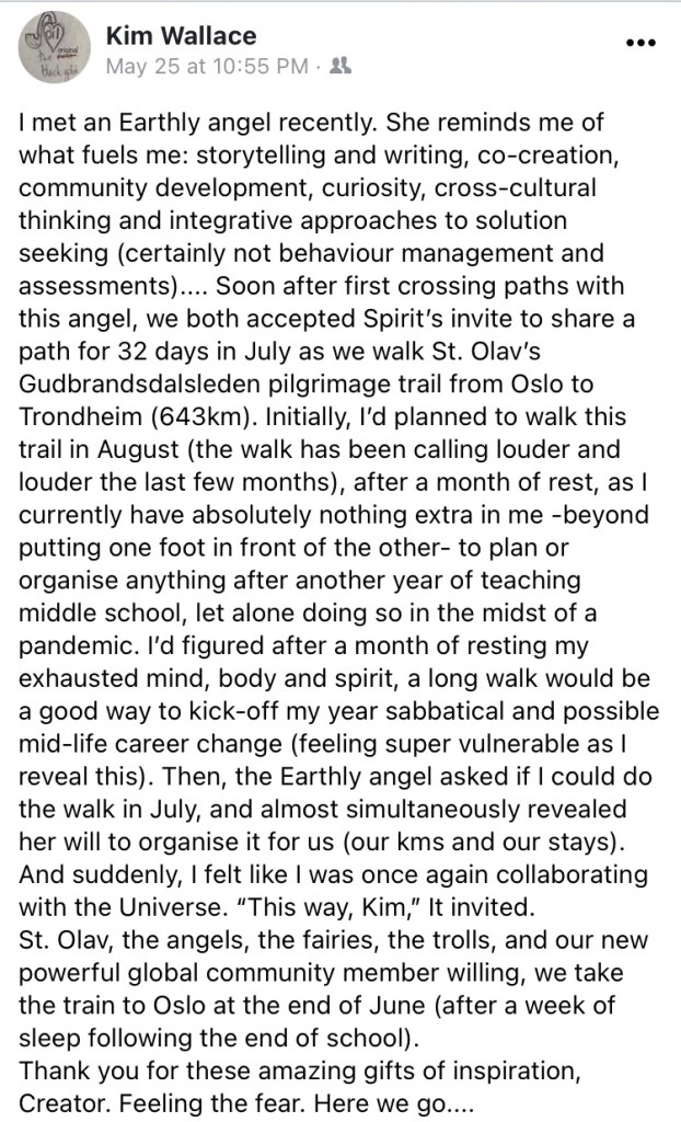 April 21, 2021: I told Carmen (my massage therapist) of my intention to walk a pilgrimage route, likely Oslo to Trondheim to begin my sabbatical. I had also been looking at ones in the U.K. but Covid-19 is in charge at the moment, and with its guidance, a walk in Norway was the easiest option. Carmen told me she had a client who had done a pilgrimage route from Sweden to Norway.