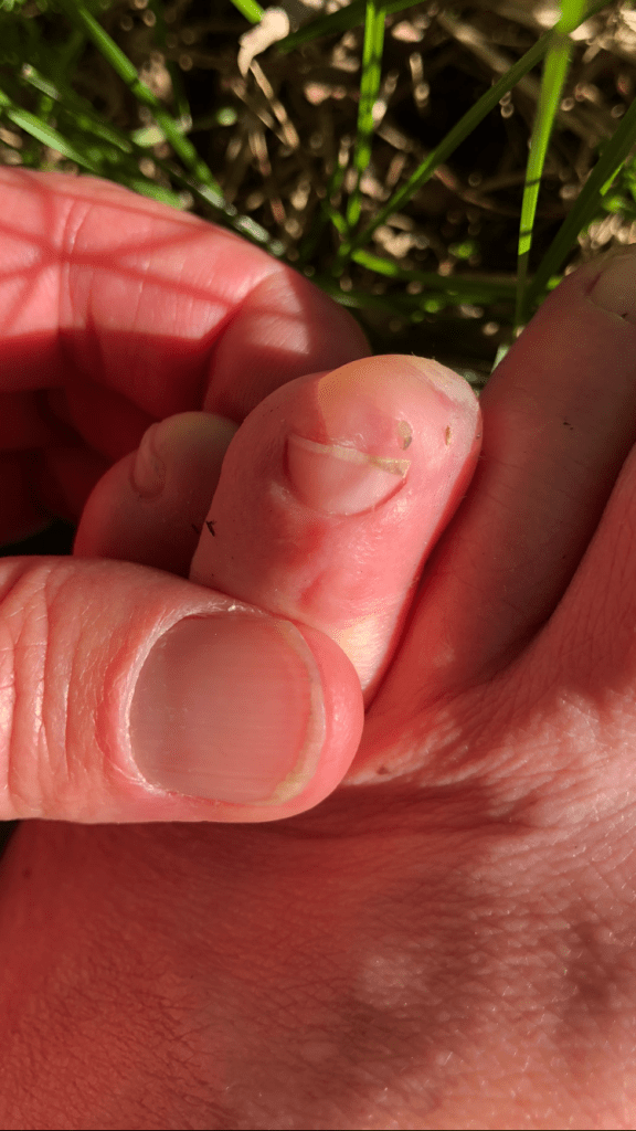 Drained my blister tonight and hopefully it will dry out a bit. Still a bit puffy, and almost covers my whole toe. Odd that it’s under the toe. Not sure I’ve had one like this. Otherwise, still doing relatively great. Took two Advil’s yesterday and today later in the day. That really helps the stiffness in my knees.