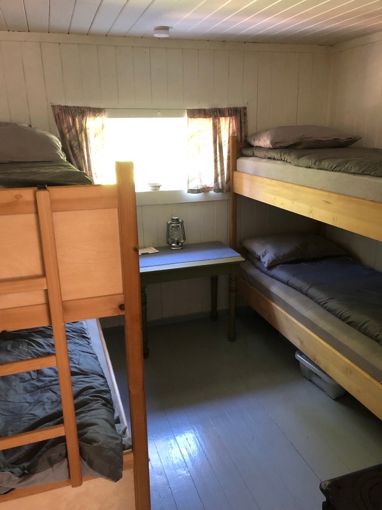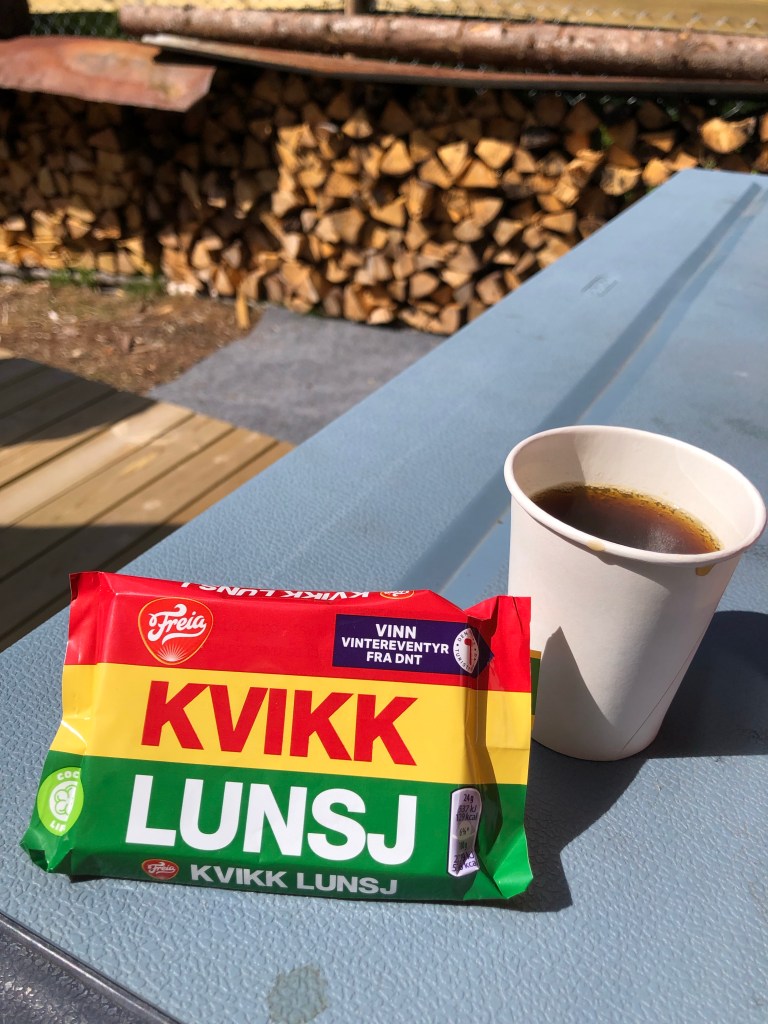The hytta is super cute!! Hytta i Skogen is hosted by Roger Jenserud. His grandfather built it after the war. Roger appears, from the details I observe here at the cabin, to be super tidy, organised, thoughtful and experienced with cabin life. There is nothing we are in need of. He’s labeled things (turn on gas) and brought us two big jugs of drinking water, and one for washing, though I believe there is a stream nearby. He also left us a Kvikklunsj, a Norwegian hiking supply since 1957. We enjoyed it with a small cup of instant coffee that we found close at hand.