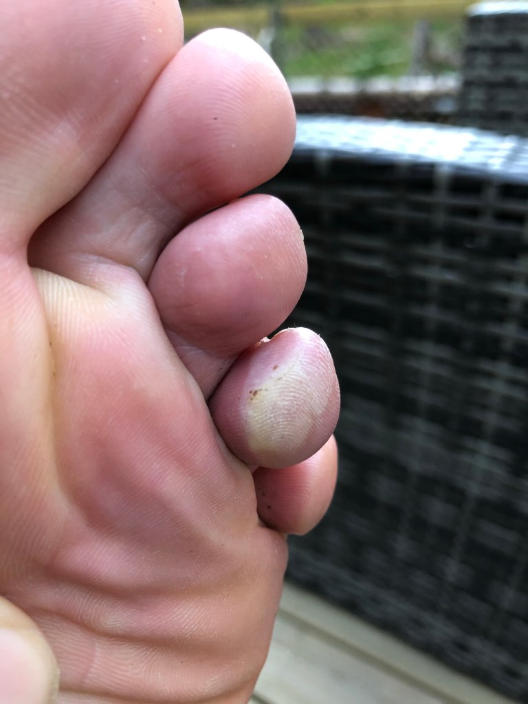 I bought new socks at 5km in Brandbu. Medium wool blend, Devold brand. So far, they feel better, less hot, than the medium Smartwool, Darn Tough and Icebreaker brands I’ve been using (which have always been fine for shorter outings and skiing). A pair of the Icebreaker ones are thinner and feel best but are ankle height and don’t offer protection from trail remnants that jump up into my socks and shoes. I’m also curious about whether my shoes are best for this. The downhills and side hills feel rough on my toes, so maybe a boot with more support would be better after all. But I hate wearing boots because my feet get so hot.
