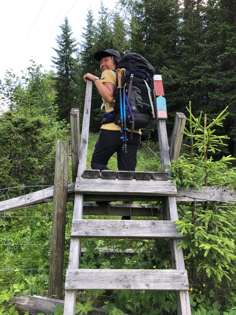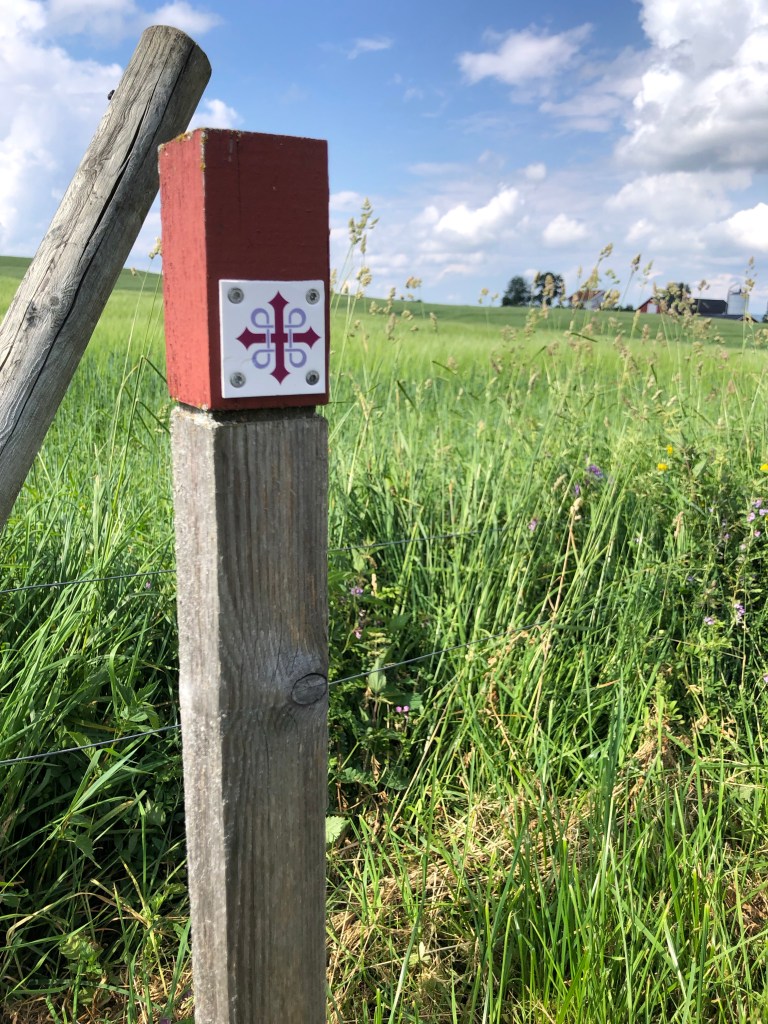9.9km snack stop at a farm settlement, after which we missed a trail sign hiding behind some logs. It didn’t take long before we were in the middle of a big field with no clear path, and we retraced our steps to quickly find the missed signpost hiding behind some cut logs.