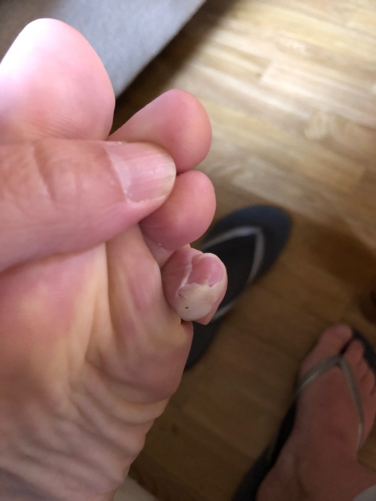 My blister is healing, but it’s made a pocket (open along the line of my toenail) in which I don’t really want to collect gribblies. Part of the skin right under the toe is not ready to come off yet but I tried cutting some of it off and using alcohol swabs to clean it. It might be a bit sensitive tomorrow.