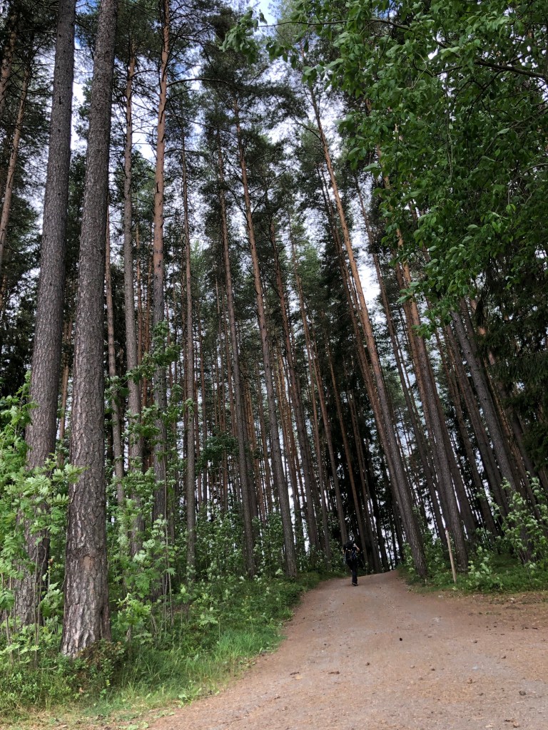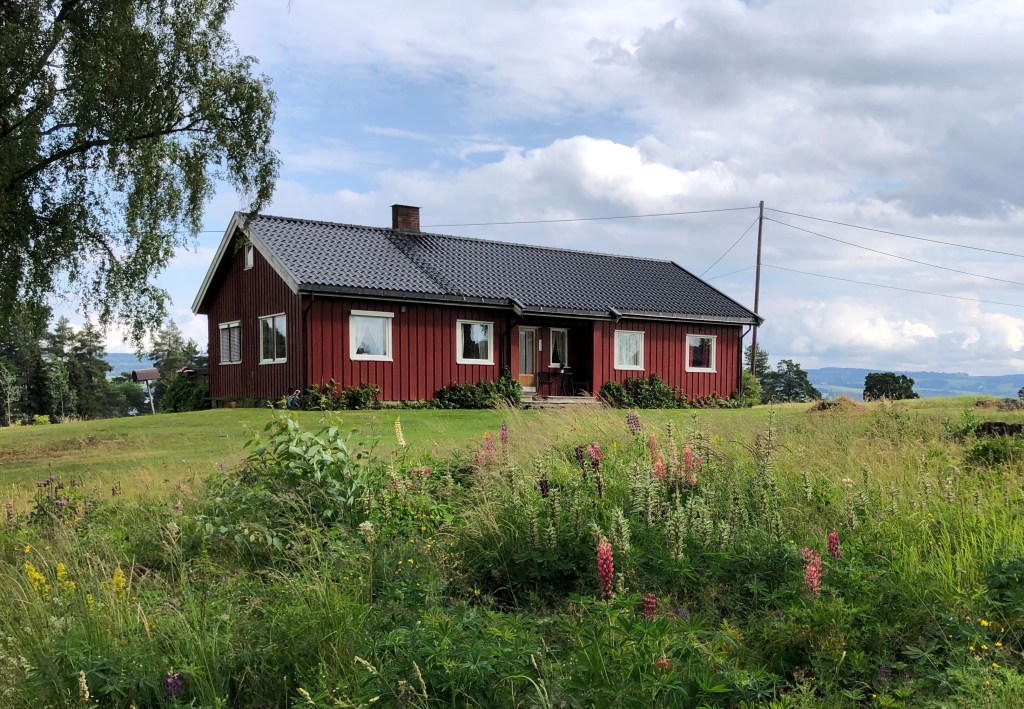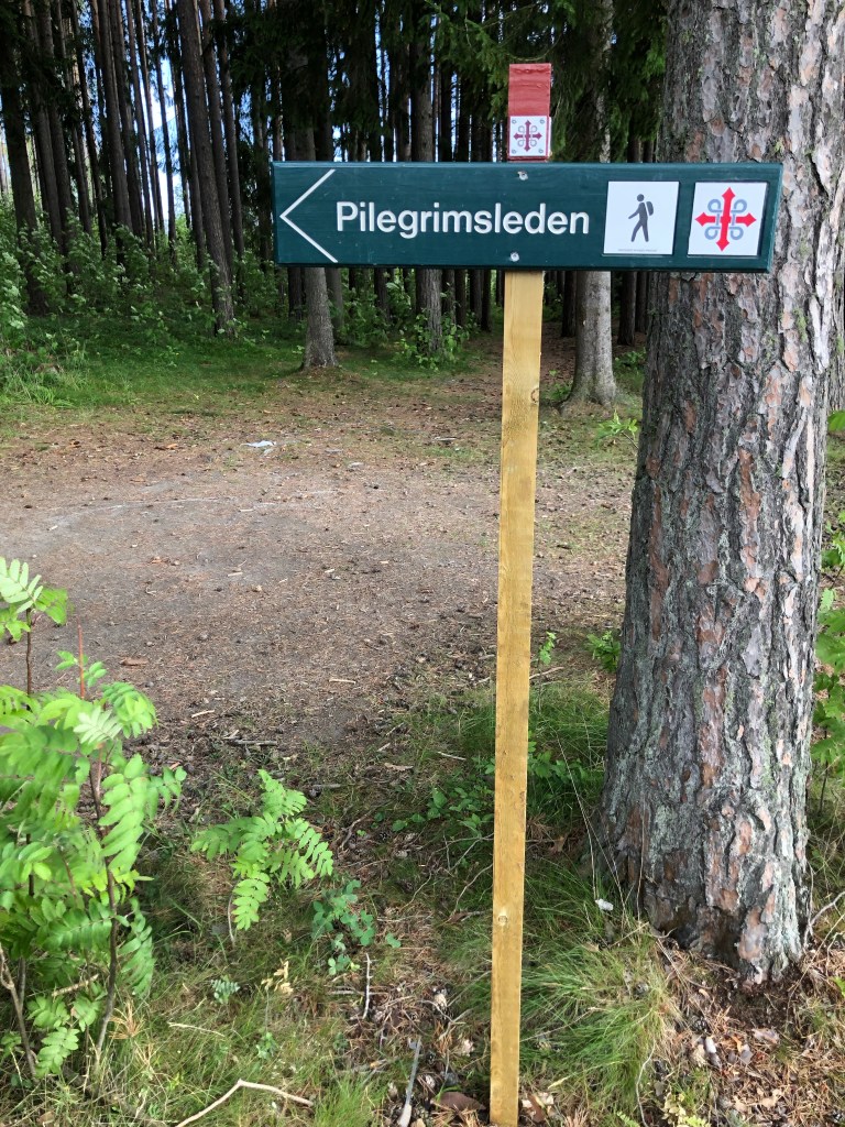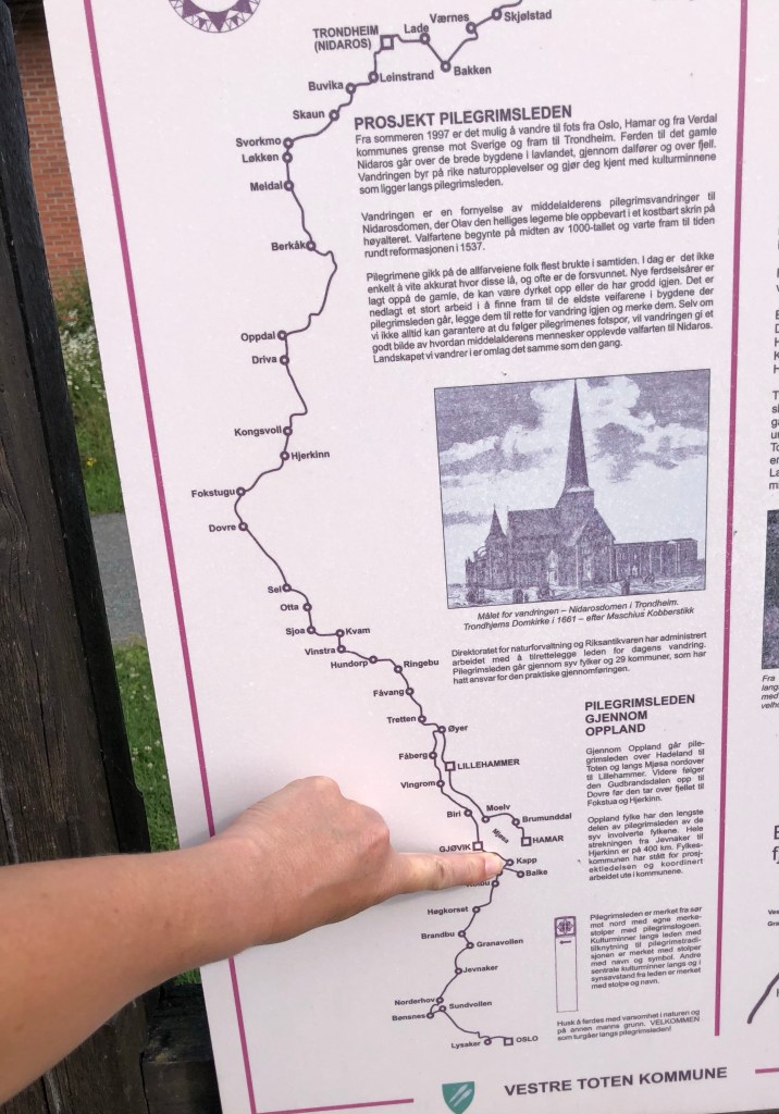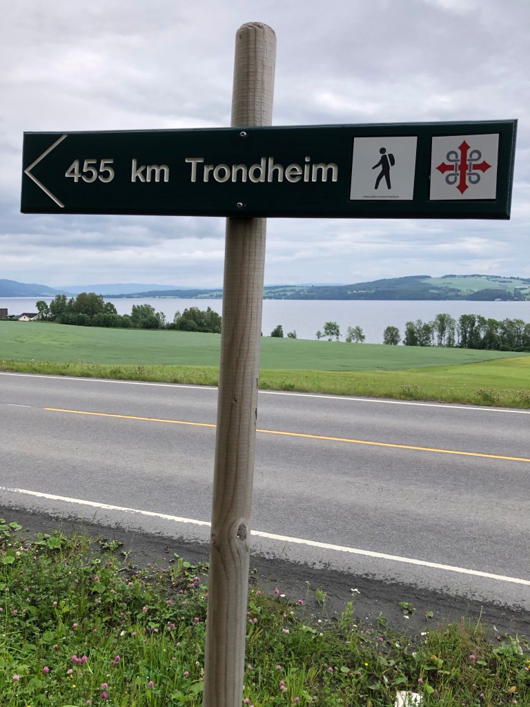 14.2 km: we followed the sign posts (mostly stickers in Gjøvik, the city of 30,000 where we’ve arrived) but then they just ended. So we looked at the map and we had been led the wrong way by the stickers. It all worked out because being misled brought us closer to the hotel. It’s easy to get back on the trail tomorrow.