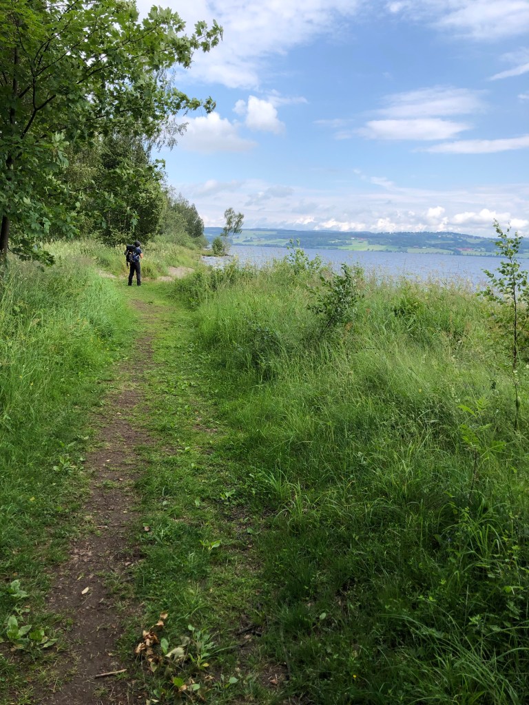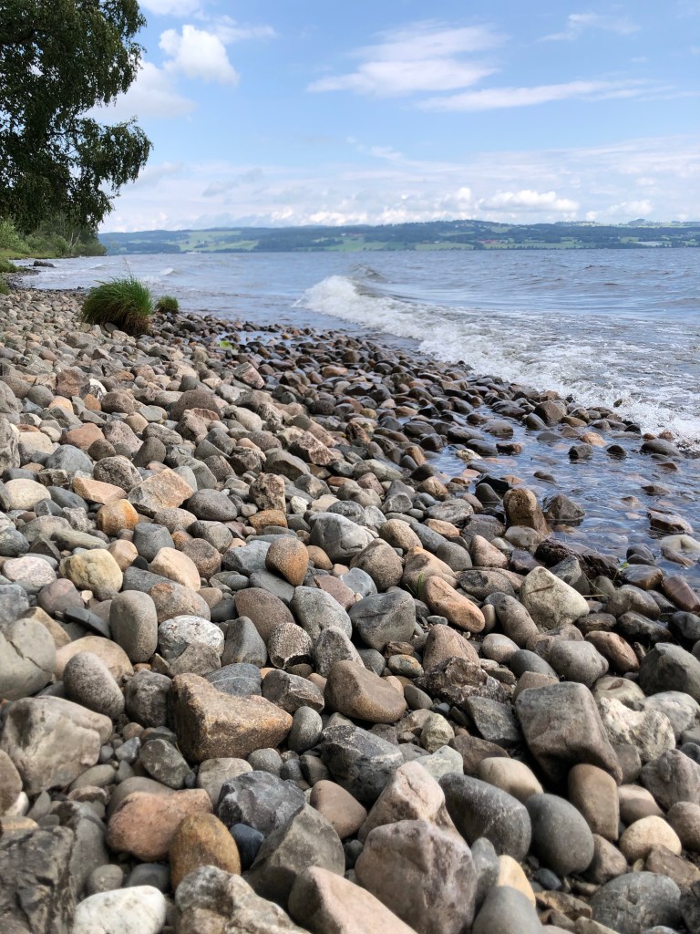 5.2 km: little break lakeside. The morning walk was mostly alongside Mjøsa (again, the largest lake in Norway at 117km long/15 km wide). I would come back and camp here. Or rent a cabin. The rocks along the beaches are heavenly…so many rounded ones and different colours. Gentle breeze and not a single mosquito. Wow!! Can’t feel my blister anymore. No tenderness even. The Compeed (like a second skin) cover helped a lot.