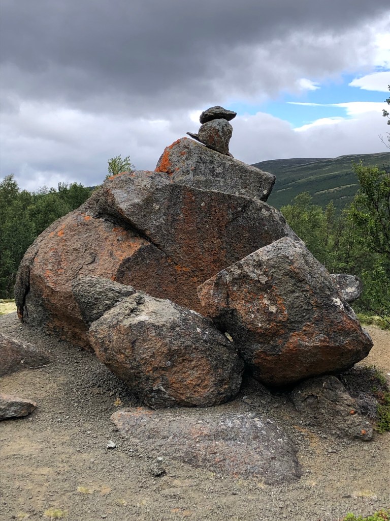 The lichen is amazing!Hello!These were curious rocks. They were very large…too large for a human to place them there (not the ones added on the very top). I wonder what the story behind them is.Bågåstelle