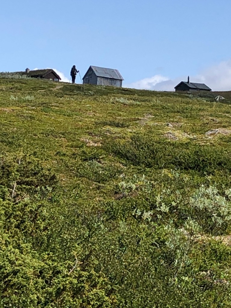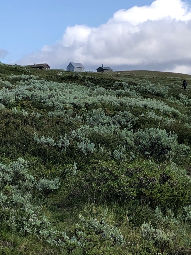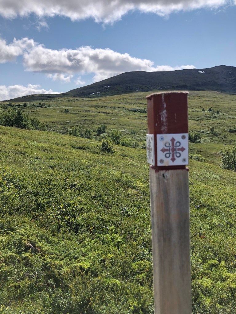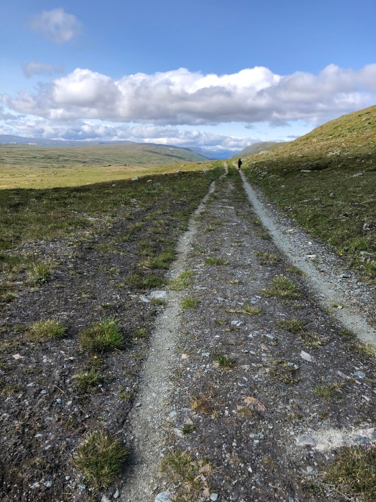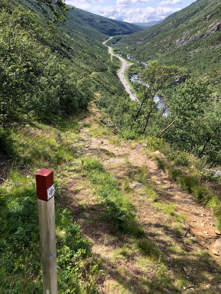 Vårstigen (Spring Trail) was the next section, and was recorded in use by pilgrims on their way to Nidaros as early as 1182. The trail runs high as the valley was often flooded and impossible to pass during the spring. Horse drawn coaches would also use Vårstigen, and it was the “most important road over the mountains for 150 years” after improvements were made to it in 1704 (Oppdal Local History Association). I saw the trail in the distance yesterday and feared we’d be walking it. I feared correctly, but it was actually a beautiful, albeit strenuous, walk up.
