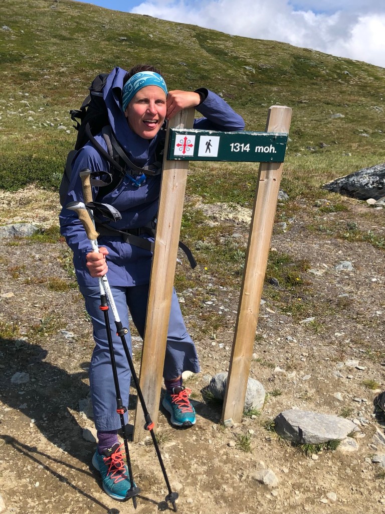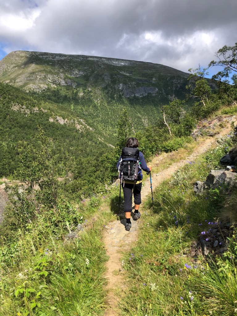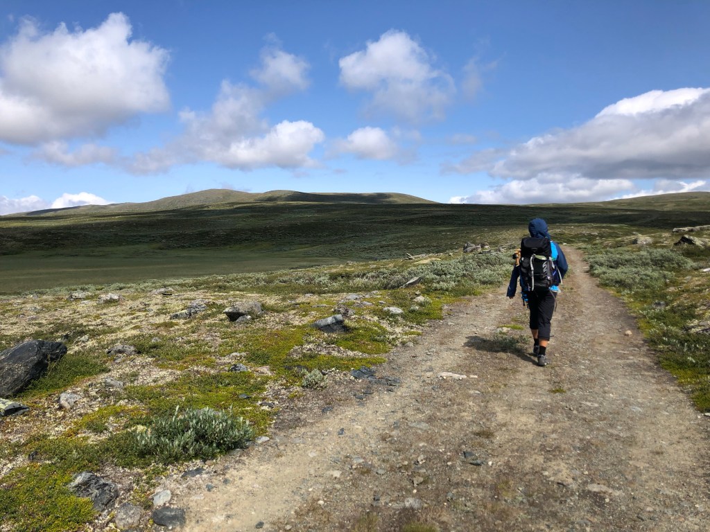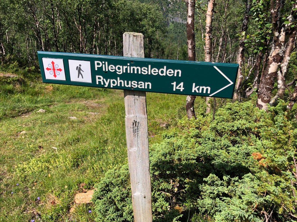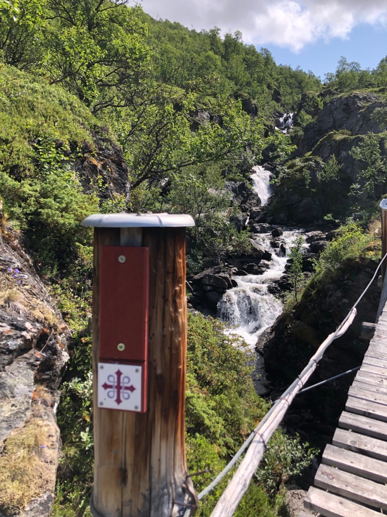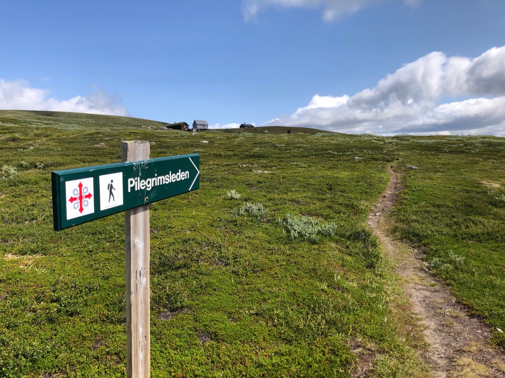 Vårstigen (Spring Trail) was the next section, and was recorded in use by pilgrims on their way to Nidaros as early as 1182. The trail runs high as the valley was often flooded and impossible to pass during the spring. Horse drawn coaches would also use Vårstigen, and it was the “most important road over the mountains for 150 years” after improvements were made to it in 1704 (Oppdal Local History Association). I saw the trail in the distance yesterday and feared we’d be walking it. I feared correctly, but it was actually a beautiful, albeit strenuous, walk up.