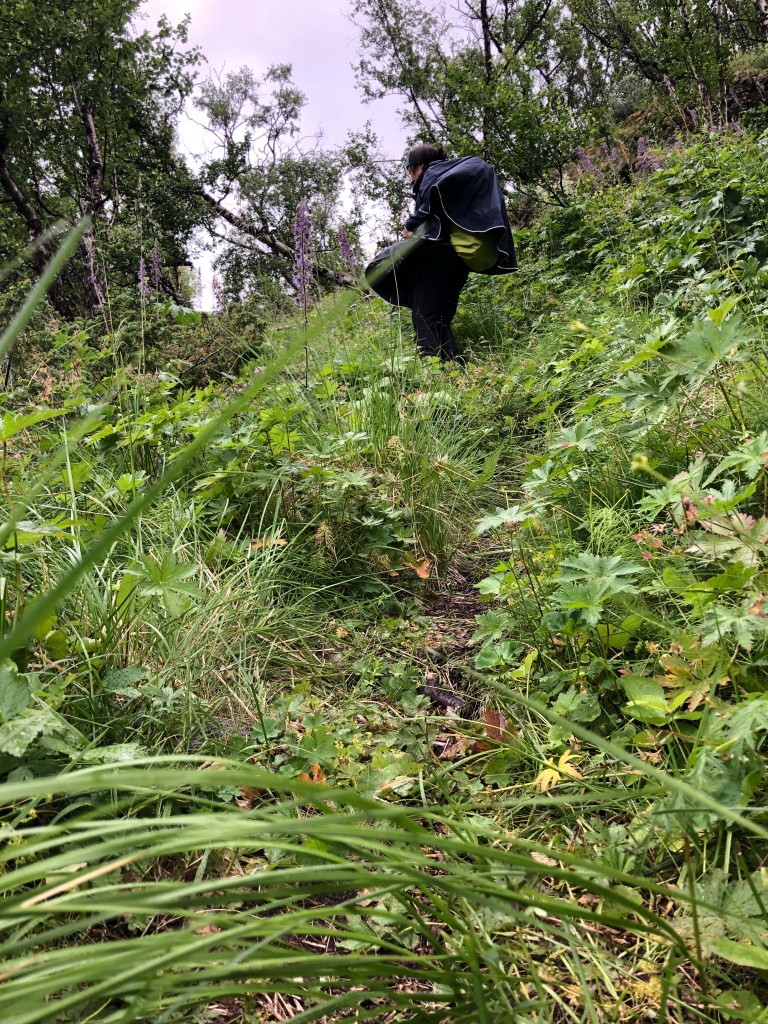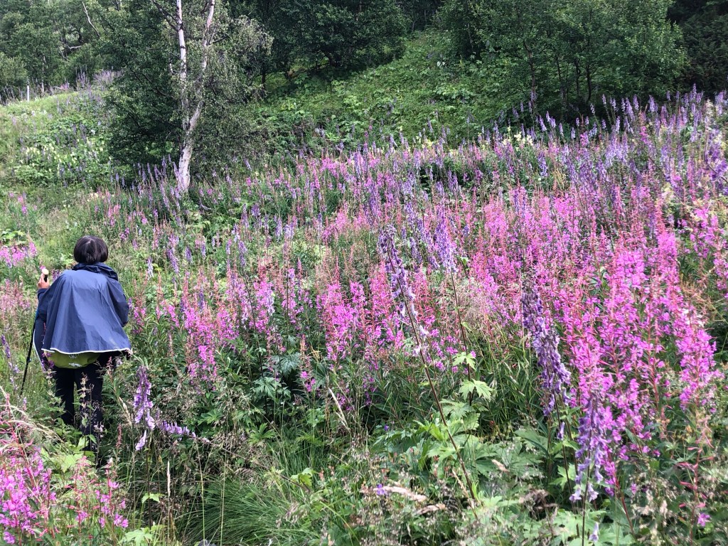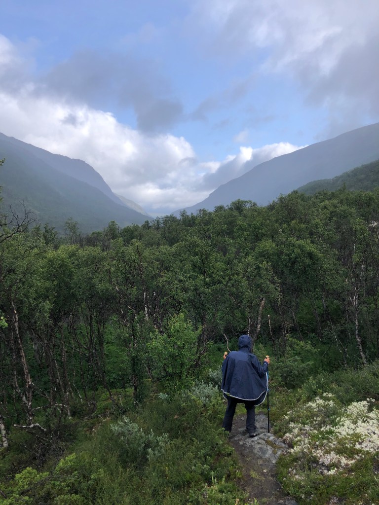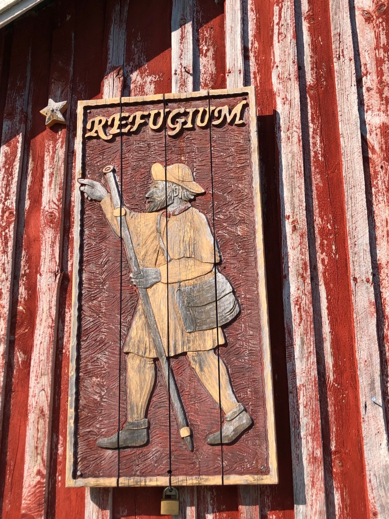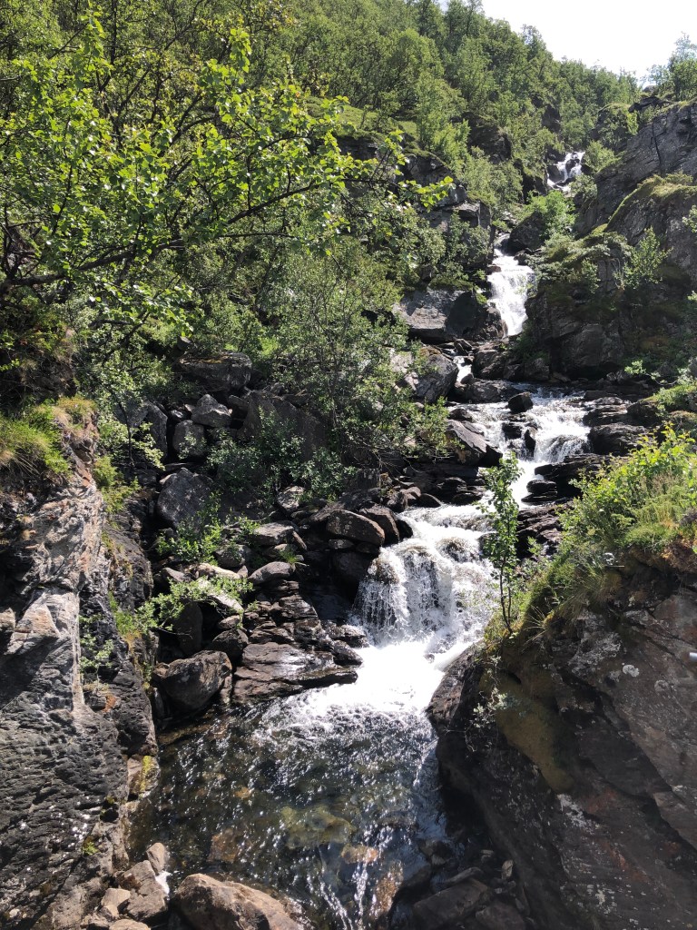 Vårstigen (Spring Trail) was the next section, and was recorded in use by pilgrims on their way to Nidaros as early as 1182. The trail runs high as the valley was often flooded and impossible to pass during the spring. Horse drawn coaches would also use Vårstigen, and it was the “most important road over the mountains for 150 years” after improvements were made to it in 1704 (Oppdal Local History Association). I saw the trail in the distance yesterday and feared we’d be walking it. I feared correctly, but it was actually a beautiful, albeit strenuous, walk up.