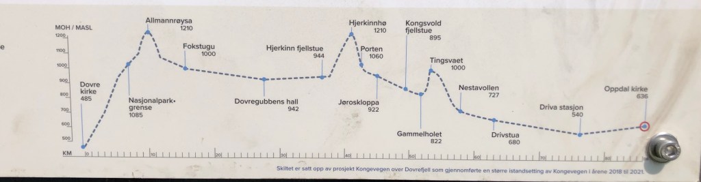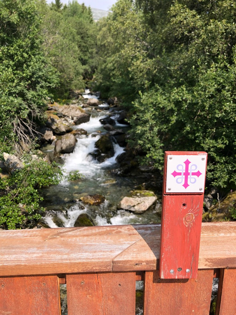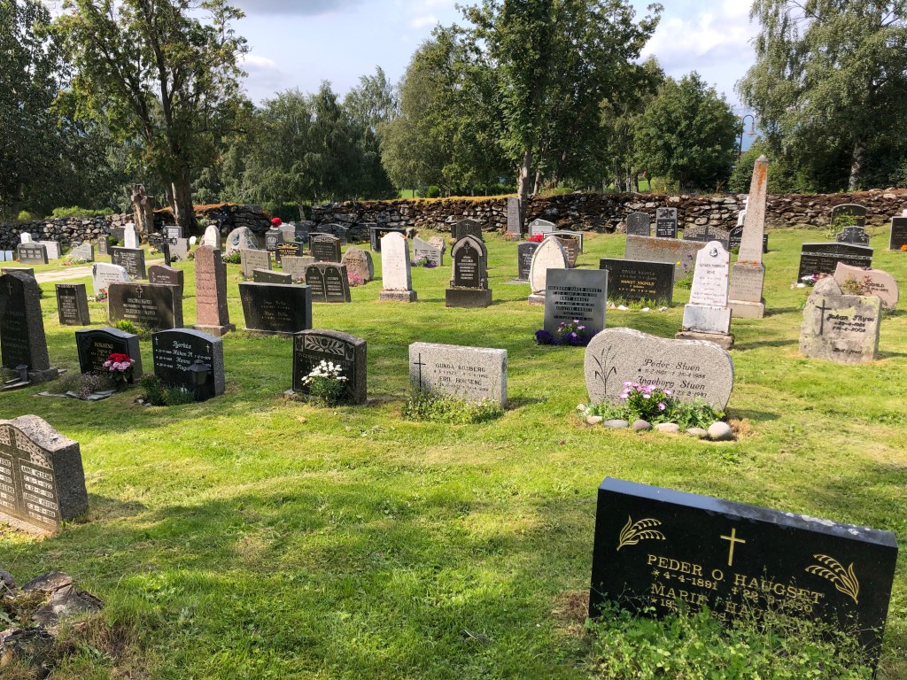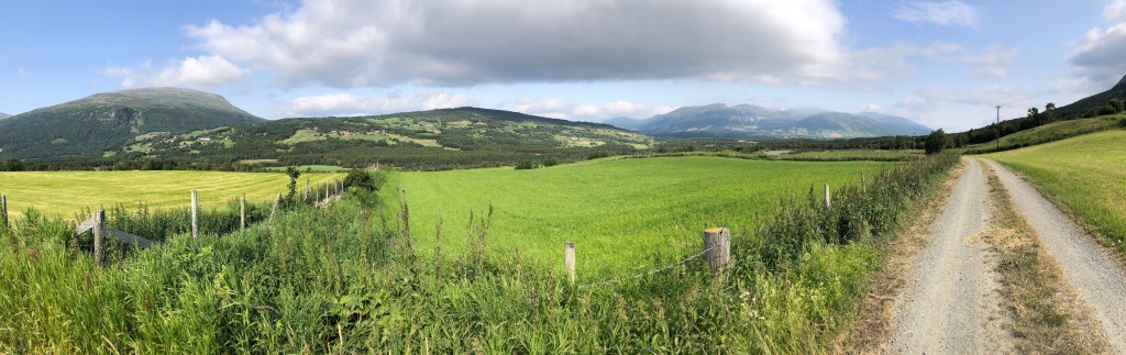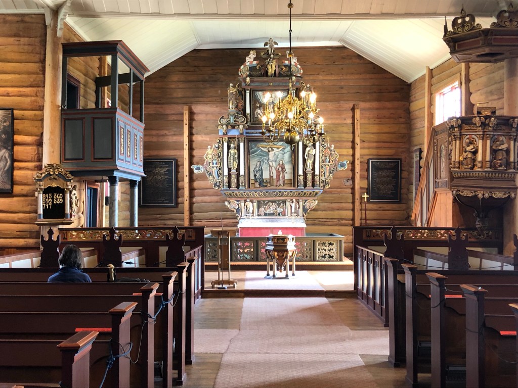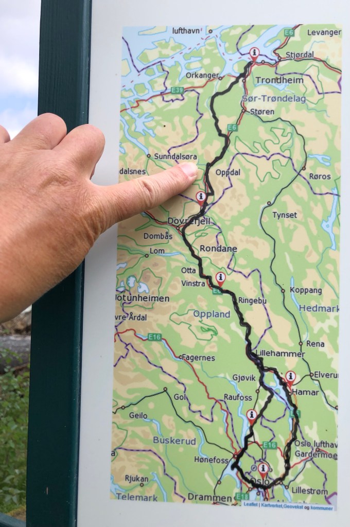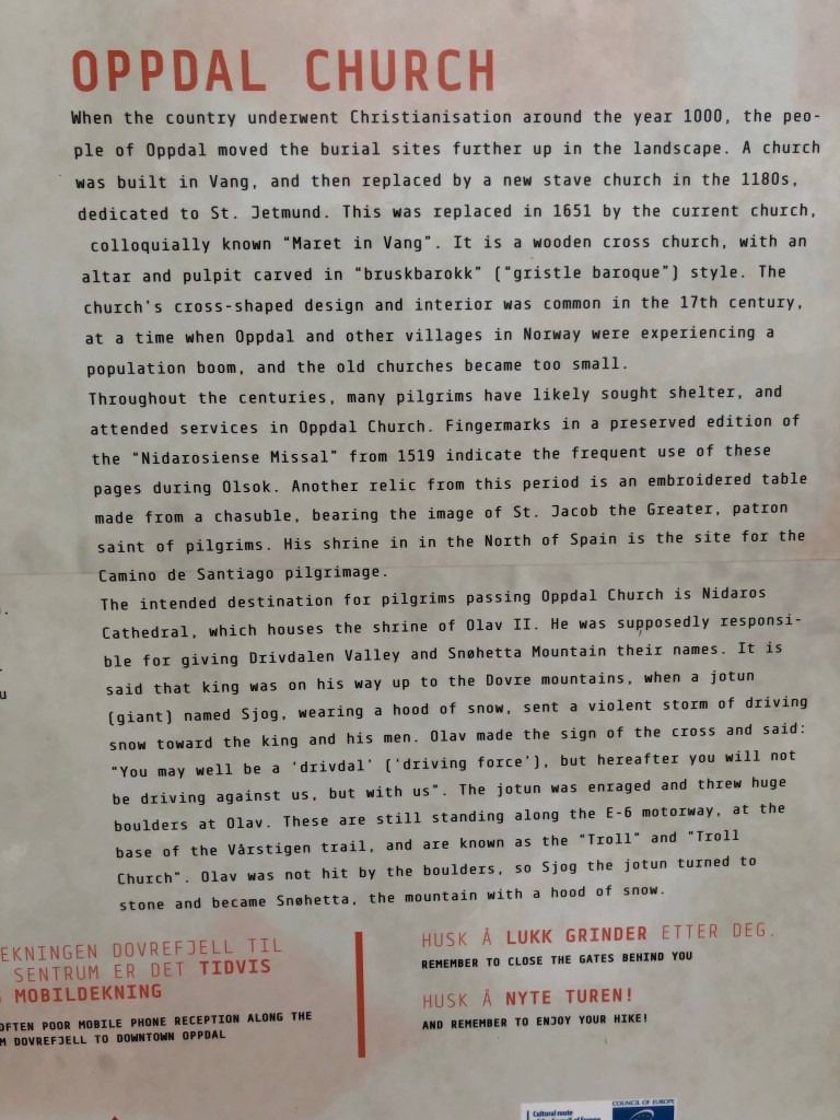After a long climb uphill, and passing Vang, the largest Viking Age burial site in Northern Europe, we arrived at Oppdal kirke at 12:40ish. It’s lovely inside with a lot of wood based ornaments. The smell of wood welcomes you into the church. Chin-Yu has been sitting in the church for awhile when I arrive. There is another milestone; 153 km left.