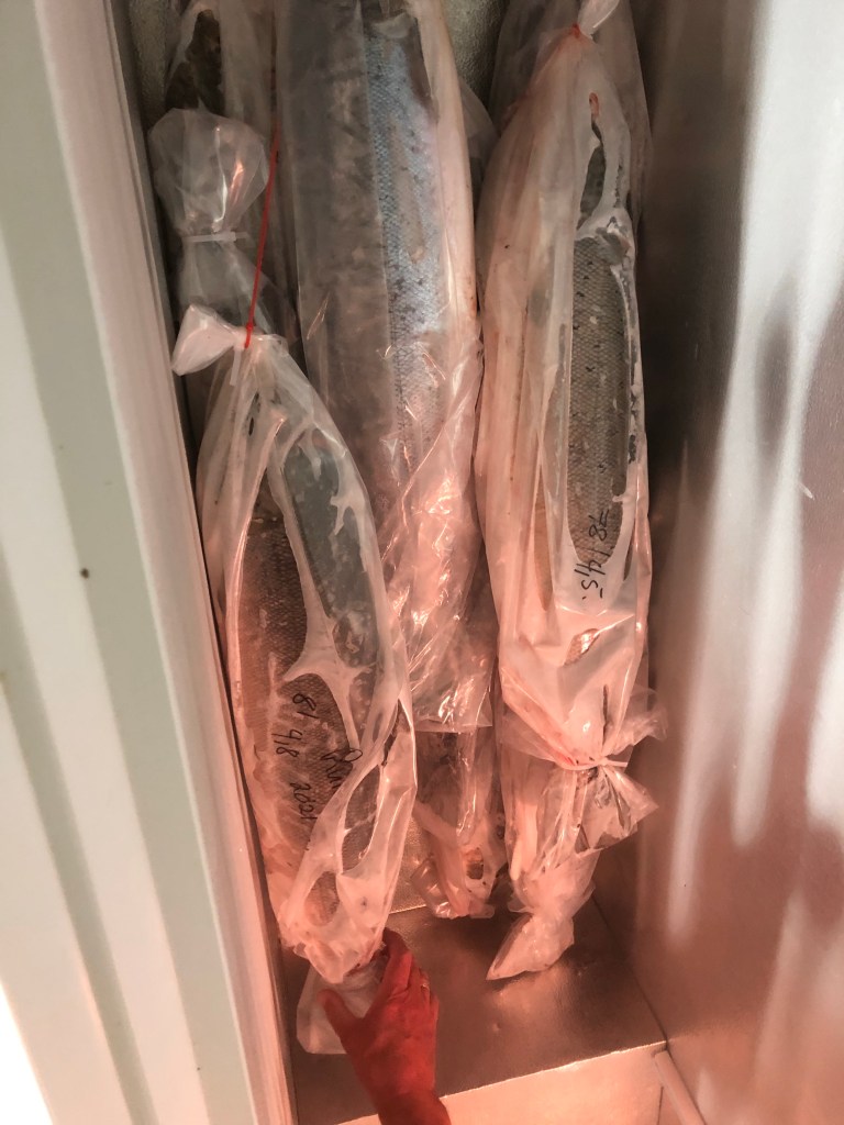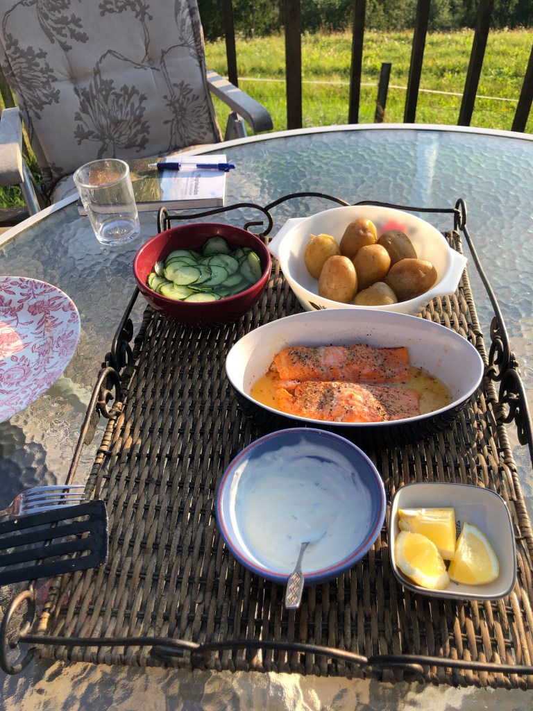 We were presented a lovely dinner on the owner’s porch. His wife is up in the mountains so he is operating on his own, and has a group of fishermen staying. The owner has title to fish salmon for 5km of the river. I tried a bit of Chin-Yu’s salmon, and with the sour cream and dill and cucumber and vinegar, it was quite okay.