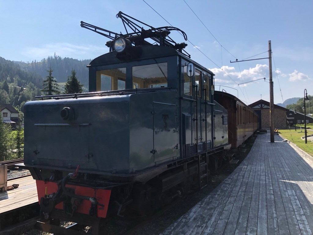 “The Thamshavn line was opened in 1908 and is the oldest electrified railway line in Norway. The track runs on the Løkken plant section to Thamshavn just outside Orkanger. The line was built to transport pyrite from Løkken works to the shipping port Thamshavn. But it also operated freight and passenger traffic in conjunction with the steamship Orkla. The line has been operated as a museum railway since 1983, first on the section Løkken verk – Svorkmo, but from 2002 expanded to go down to Bårdshaug in Orkanger. The train equipment is the same as was used during the track’s operating time” (pilegrimsleden.no).