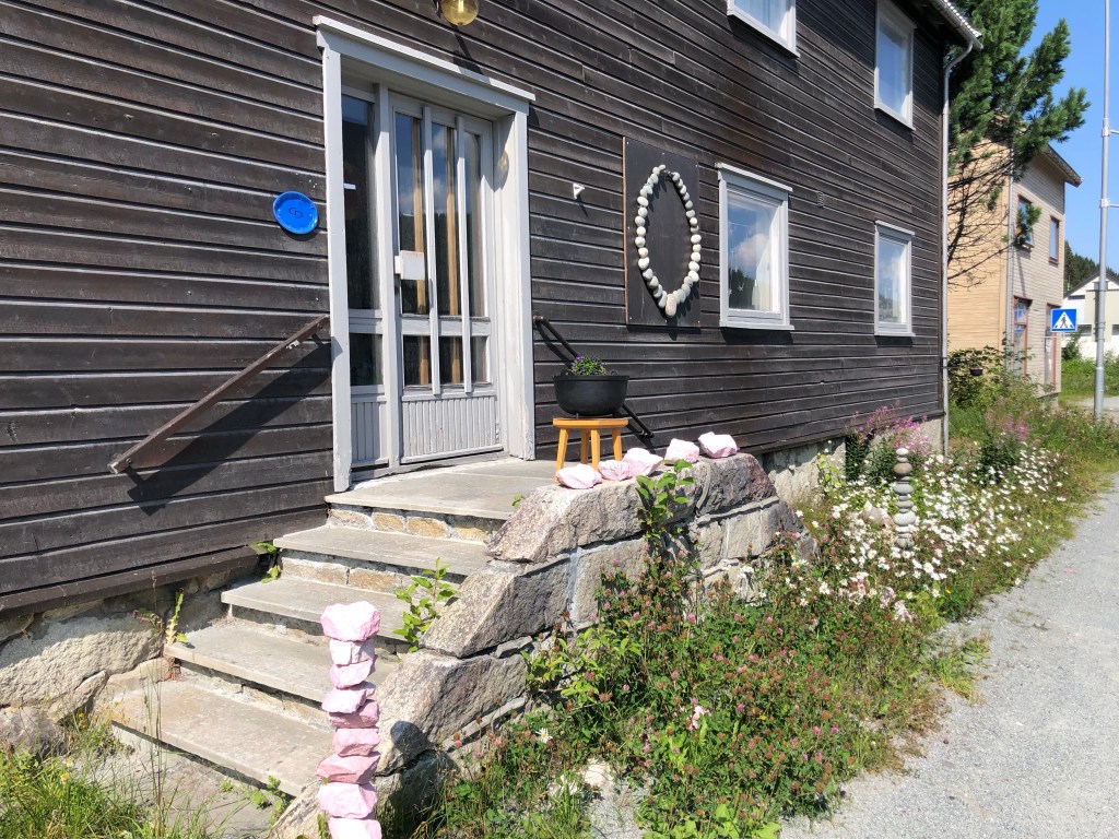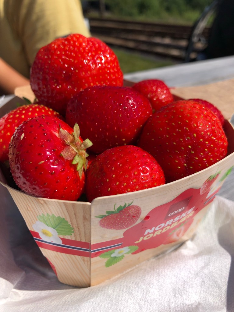 The trail started as a spacious roadside trail where we didn’t have to think about the cars, then some forest trail, a quiet dirt road, and finally, the asphalt into the townsite and flat. We stopped in Løkken Verk, a copper mining town, to get some groceries and ate some fresh Norwegian strawberries. Slurp!