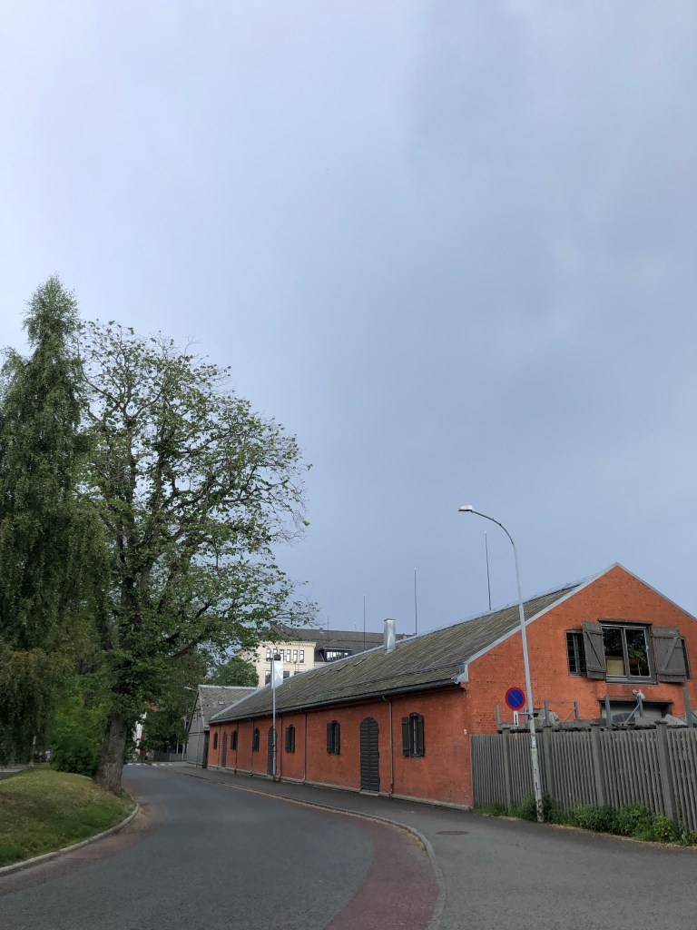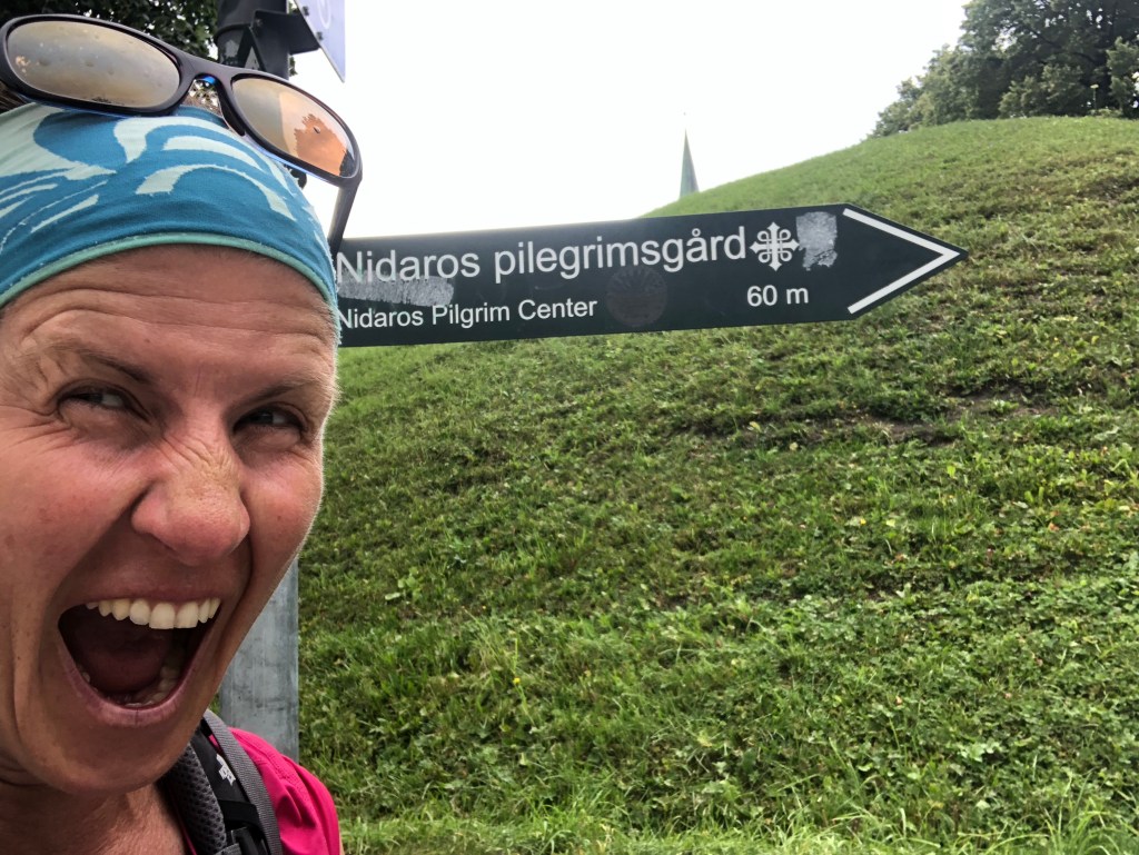 I took my shoes off here, and walked the last 300 m in bare feet. The soft grass was cool and refreshing on my feet. Two young crows cawed their greetings, and finally, after 643 km and 32 days of walking, we arrived at the Nidarosdomen Pilgrim Centre!