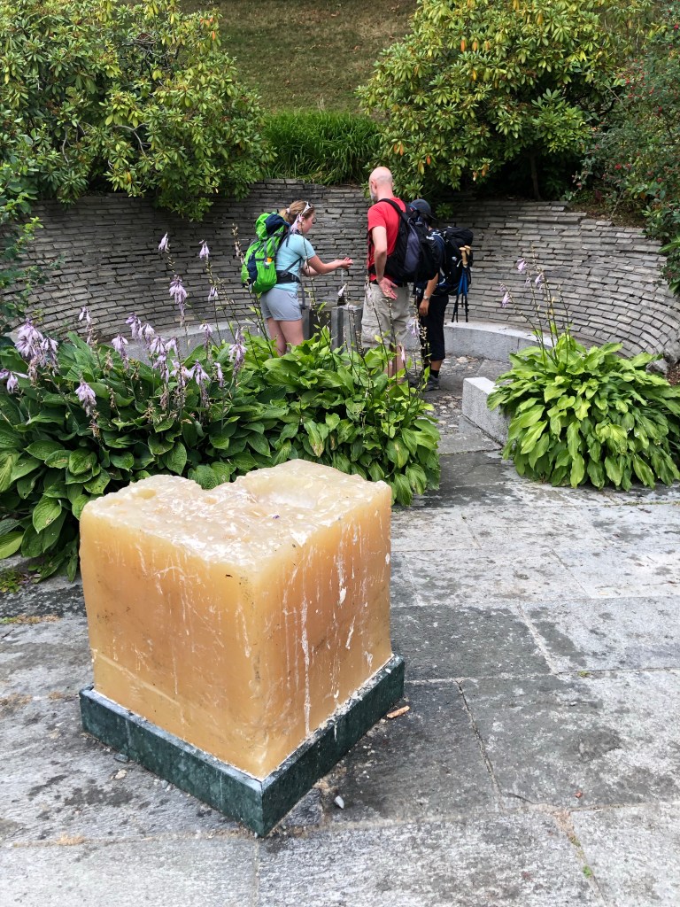 Soon after, we arrived at the spot it is said that “Olav the Holy had lain in the ground, where a beautiful spring came up, and people were cured of diseases by that water” (pilegrimsleden.no). We drank from the fountain and sprinkled water on our knees and feet just in case the curative powers actually work.