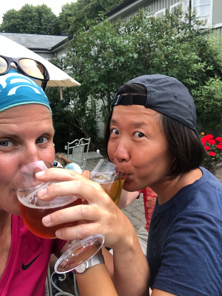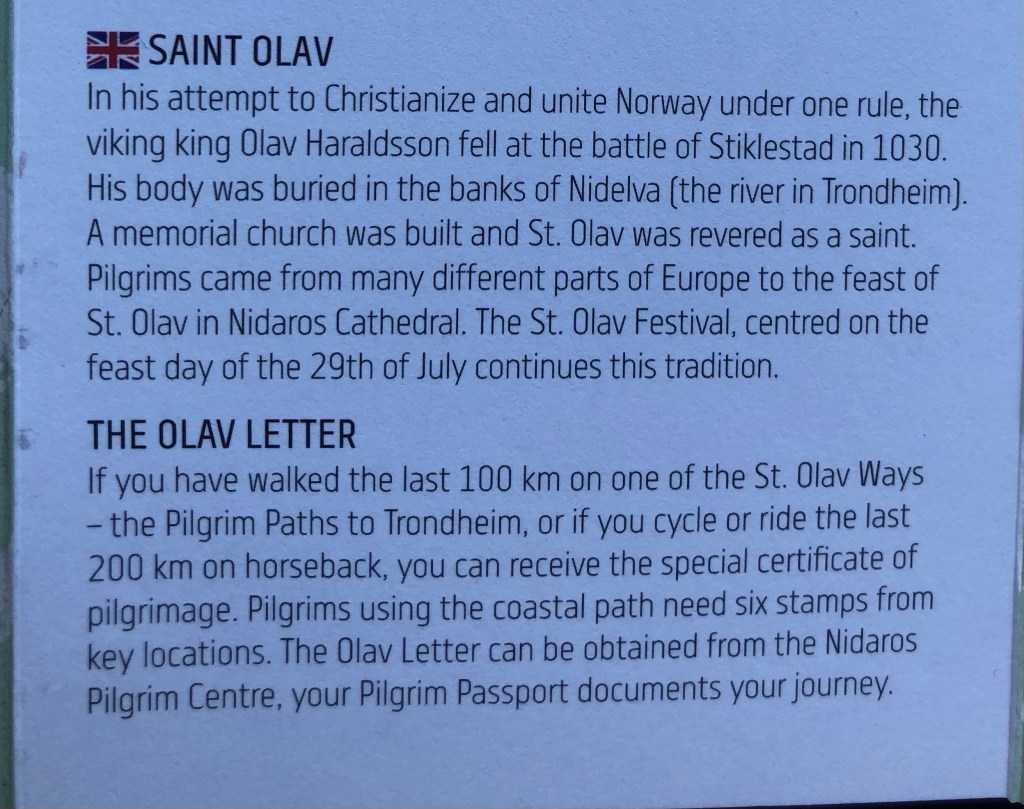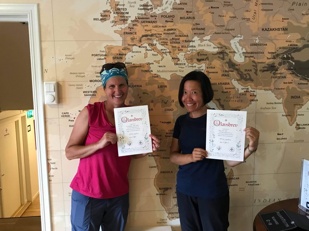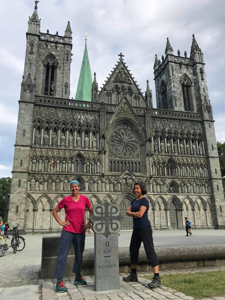 After a celebratory beer bought for us by Sture, and receiving our St. Olav letters that state that we walked the trail, the four of us walked to the 0 km milestone at the front of the nearly 1000 year old Nidarosdomen Cathedral. As we took some photos, we also noticed and chatted with Maike, the young German woman we’d met earlier along the trail before and after Lillehammer. She’d arrived four days before us with her massive 20 kg bag and her tall, clearly strong, resilient body.