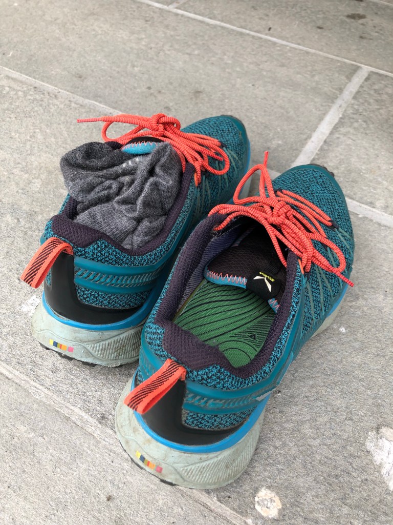 At 6.2 km, we treated a hot spot (arising blister) on Ariel’s foot, and I gave her a pair of my wool socks to wear instead of the thin cotton ones she had brought. Still, no complaints.