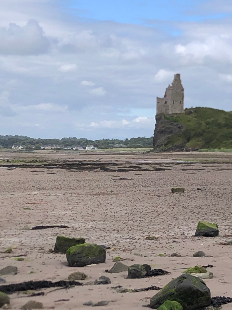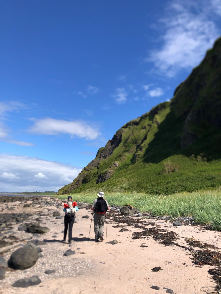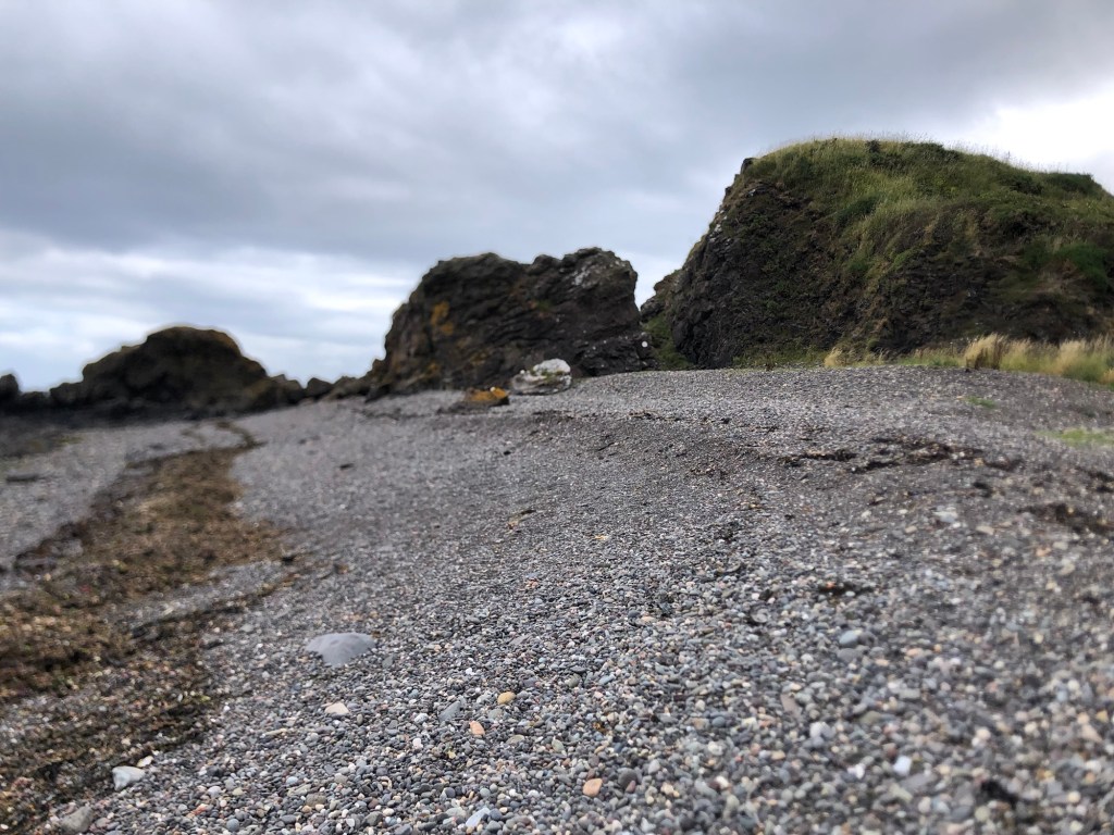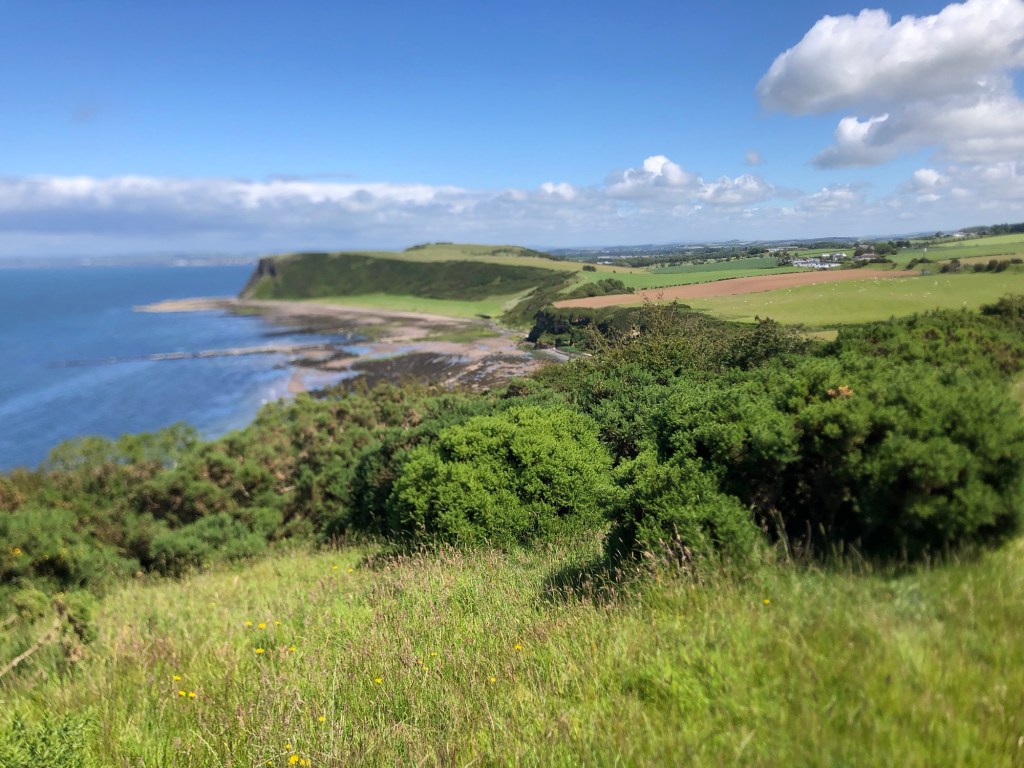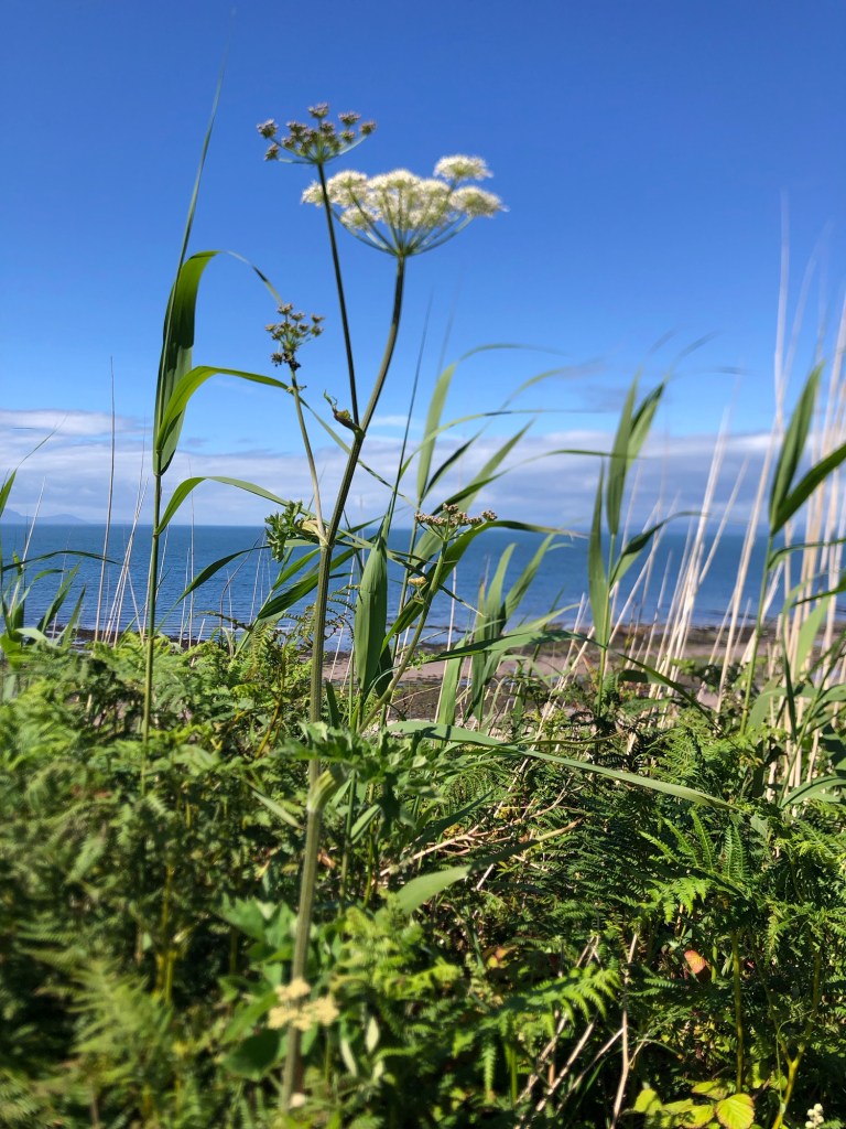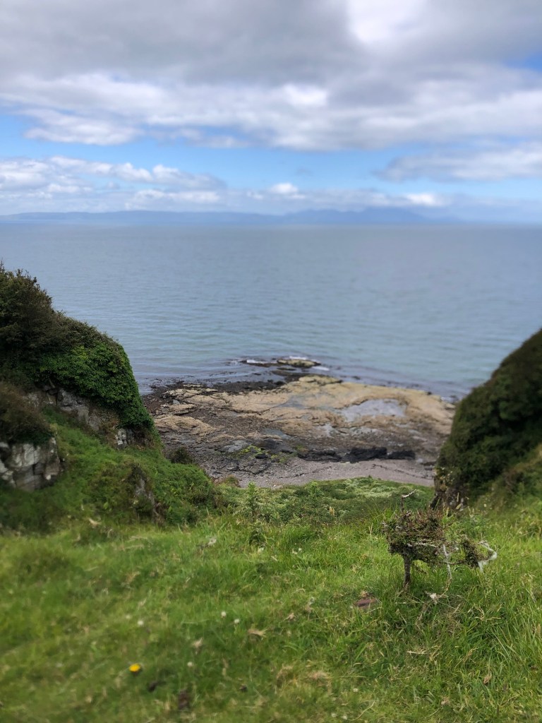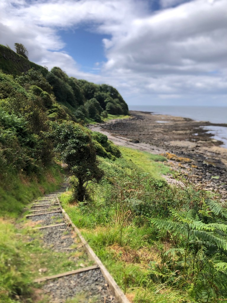 The inhabitants of the castle kept pigeons in this structure (doocot) for meat and eggs. There is an entrance on the other side.Limekiln. Dunure HarbourApparently, there are agates on these beaches! Imagine how long I could spend searching!Damn. The cows. Gah! First ones not behind a fence.Gillian was super brave and began to walk through them. Maybe if we had stuck together, they would have moved away from us? The coos held their ground though, as Dad and I hesitated, and we all backed up and went around another way. Coos 1, Humans 0.Gillian explaining the hard work the Ayrshire Coastal Path’s volunteers have done. So much gratitude to them all. They’ve facilitated a spectacular experience, and with continued support to maintain it, the trail has potential to attract walkers of all ages from around the world.Some bins for plastic found along the shoreline. There is a lot. It would be nice to know where they reside so intentional collection can occur. People have to use them as plastic bins though, not garbage bins, or the volunteers can’t continue to provide the service.Resilience Plastic and other trash that people have buried under the ground is beginning to seep out of the cliff side. Reminds me of “He-y, Come on Ou-t!” by Shinichi Hoshi.Our lunch view. There’s a perfect grass bench at the top of the stairs. The ACP follows an old railway path at this point. Easy walking!Spectacular. We walked behind these fields to the right of this shot, and through the red and far green fields, then down to the beach, and around the head in the distance.A field of broad beans.Hogweed (Cow Parsnip)GeraniumDown to the beach.My kind of beach!Coolest formations (photo credit: Gillian)We heard and then saw four peregrine falcons around this point. Maybe they were fledging? They looked like they were having fun on the wind currents.So many patterns.And more patterns.Heads of Ayr is behind us now. Tide is waaaay out!Greenan Castle, another Kennedy tower house from 1600s. Those Kennedys have some stories about their land acquisitions.Off the beach and up to the long esplanade as we enter Ayr.Marker for a bike path.So much green.