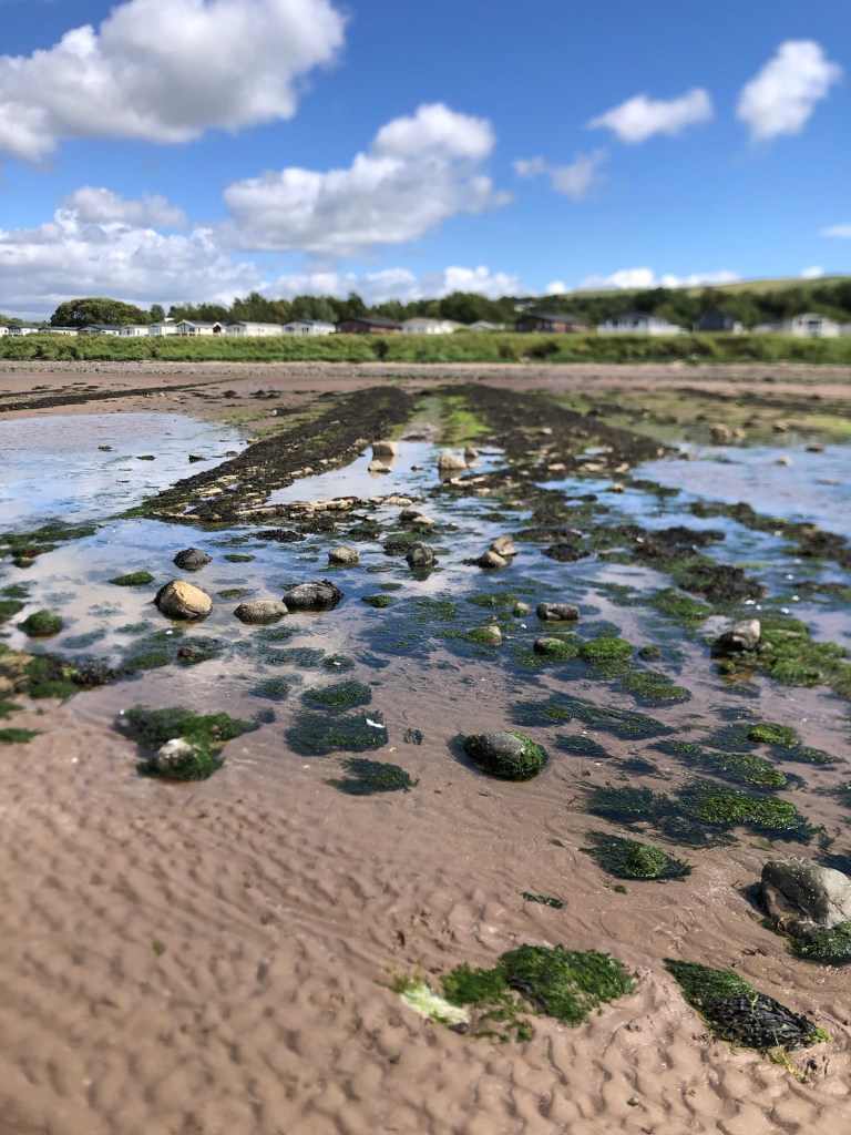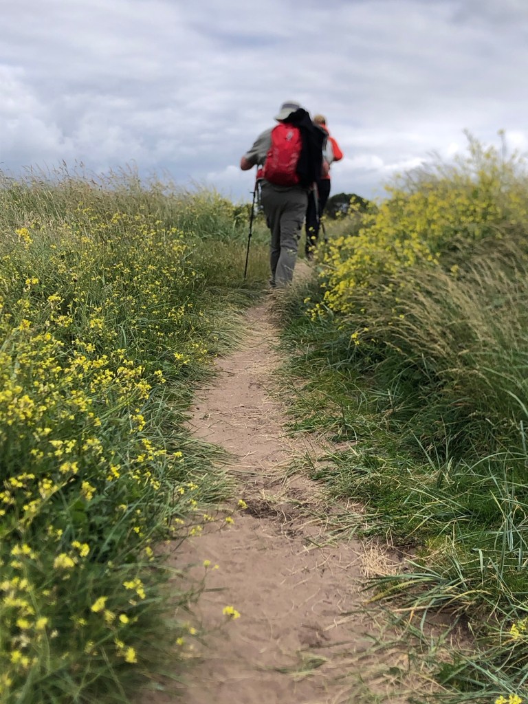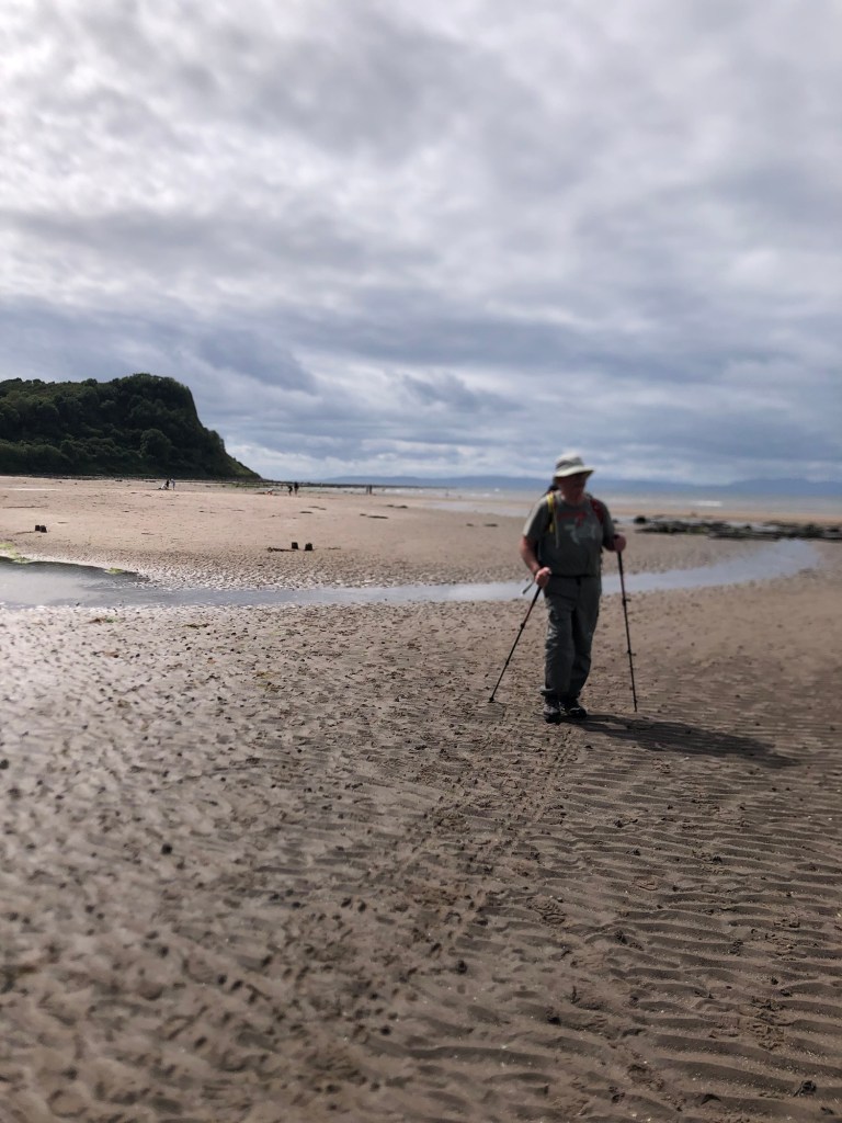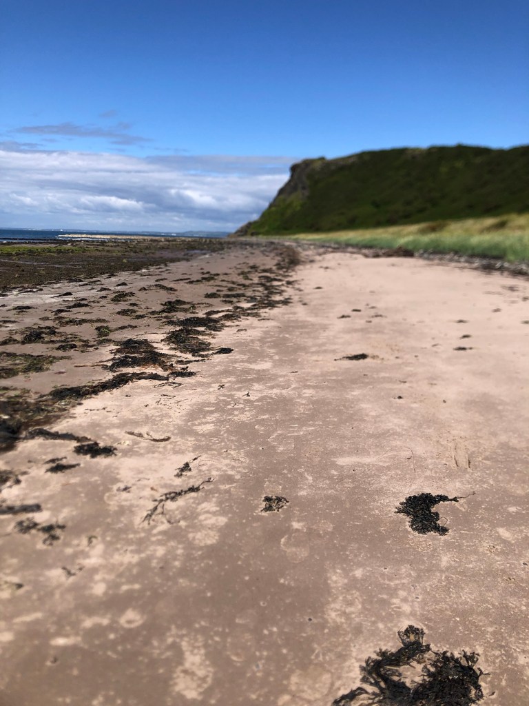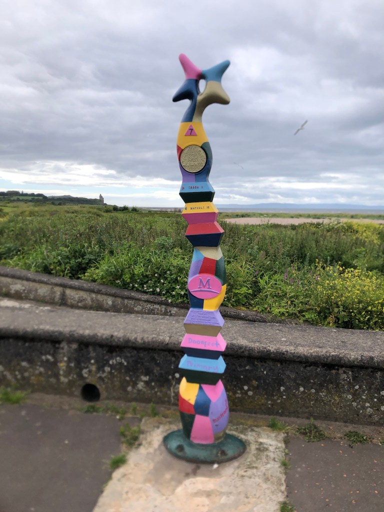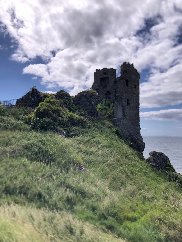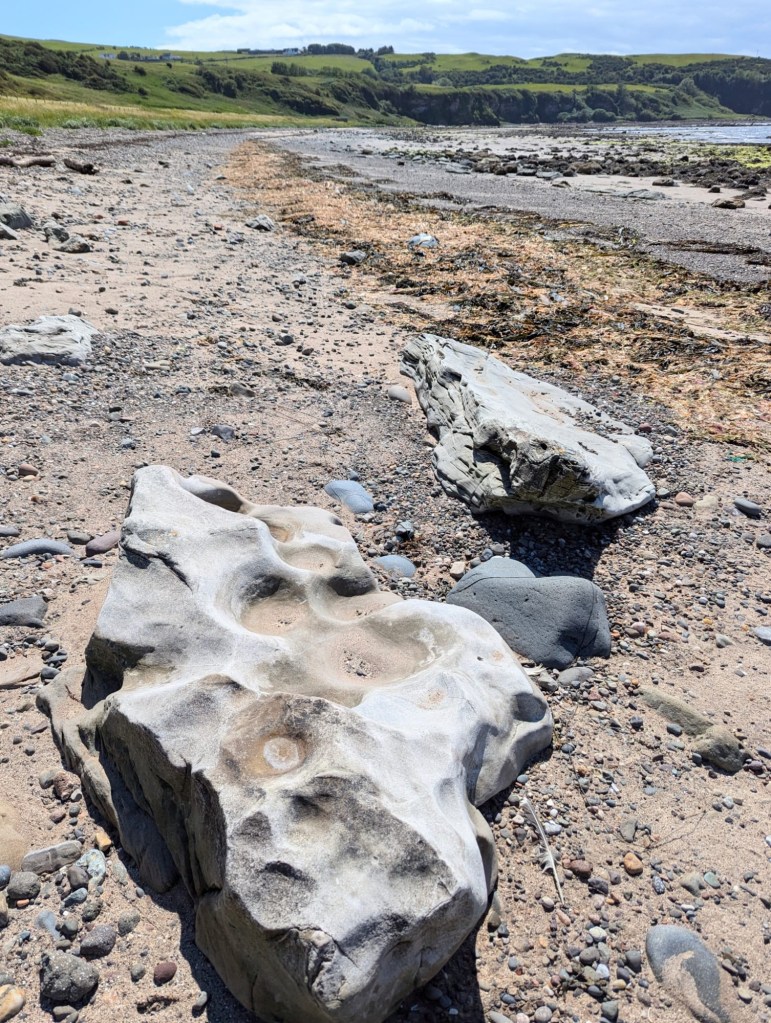 The inhabitants of the castle kept pigeons in this structure (doocot) for meat and eggs. There is an entrance on the other side.Limekiln. Dunure HarbourApparently, there are agates on these beaches! Imagine how long I could spend searching!Damn. The cows. Gah! First ones not behind a fence.Gillian was super brave and began to walk through them. Maybe if we had stuck together, they would have moved away from us? The coos held their ground though, as Dad and I hesitated, and we all backed up and went around another way. Coos 1, Humans 0.Gillian explaining the hard work the Ayrshire Coastal Path’s volunteers have done. So much gratitude to them all. They’ve facilitated a spectacular experience, and with continued support to maintain it, the trail has potential to attract walkers of all ages from around the world.Some bins for plastic found along the shoreline. There is a lot. It would be nice to know where they reside so intentional collection can occur. People have to use them as plastic bins though, not garbage bins, or the volunteers can’t continue to provide the service.Resilience Plastic and other trash that people have buried under the ground is beginning to seep out of the cliff side. Reminds me of “He-y, Come on Ou-t!” by Shinichi Hoshi.Our lunch view. There’s a perfect grass bench at the top of the stairs. The ACP follows an old railway path at this point. Easy walking!Spectacular. We walked behind these fields to the right of this shot, and through the red and far green fields, then down to the beach, and around the head in the distance.A field of broad beans.Hogweed (Cow Parsnip)GeraniumDown to the beach.My kind of beach!Coolest formations (photo credit: Gillian)We heard and then saw four peregrine falcons around this point. Maybe they were fledging? They looked like they were having fun on the wind currents.So many patterns.And more patterns.Heads of Ayr is behind us now. Tide is waaaay out!Greenan Castle, another Kennedy tower house from 1600s. Those Kennedys have some stories about their land acquisitions.Off the beach and up to the long esplanade as we enter Ayr.Marker for a bike path.So much green.